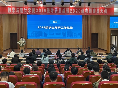 为总结我院2019级学生考研工作,并激发2020级学生的考研热情、增强考研信心、交流考研经验,推进学院学风建设,4月26日晚,数学与统计学院在滨江楼二楼报告厅召开“2019级考研总结暨2020级考研动员大会”。全体院领导、2019级和2020级班主任、全体辅导员,2019级、2020级和2021级部分学生代表参加会议。会议由院党委书记贾冰主持。