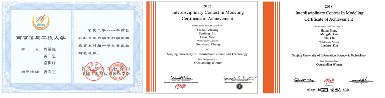 · Outstanding award in COMAP's Mathematical Contest in Modeling (MCM) / Interdisciplinary Contest in Modeling (ICM) (2012, 2018, 2019, 2022)