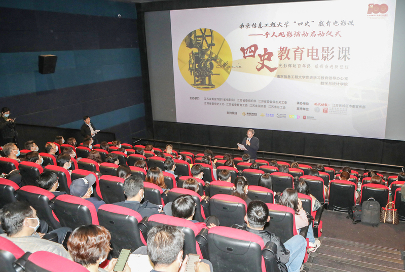 “前事不忘,后事之师。以史为鉴,才能走好未来的路。”4月27日下午,我校在大地电影院举行“四史”教育电影课千人观影启动仪式。这是我校今年党史学习教育的重要活动之一,千余名师生将陆续走进影院,重温经典,感悟精神,致敬百年。校党委书记管兆勇出席并宣布千人观影活动启动,在宁全体校党委领导班子成员、校党委委员、校党史学习教育领导小组及办公室成员、离退休教师代表、海外归国教师党员代表、研究生学生代表、本科生学生代表,以及数学与统计学院师生党员代表百余人参加了首场观影活动。启动仪式由副校长闵锦忠主持。