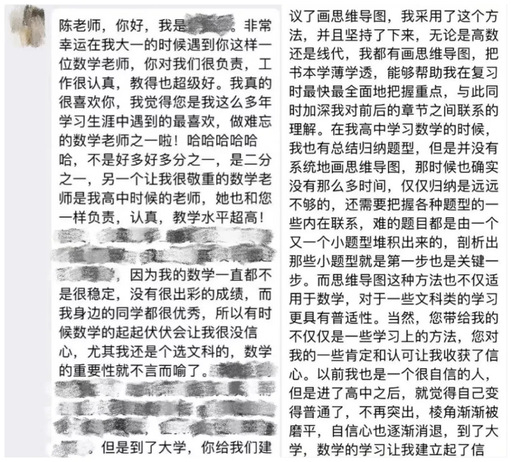 作为公共基础课的教师,公共数学教学部的老师们可谓“桃李满天下”。“从教20多年,日常感受到来自同学的爱,上课咳嗽了下课就有含片贴心地放在讲台,疫情期间线上课后满屏都是‘老师辛苦了!’,推免到985名校的同学第一时间发来喜报……”与学生相处的点点滴滴都是被吴亚娟珍藏起来的宝贵回忆。“有许多非数统院的学生毕业后也一直与我们保持联系,节假日的短信祝福从不落下。高数课程的教学仅有一年,学生们却记住了老师数十年,让我们非常感动。”陈群感慨地说。