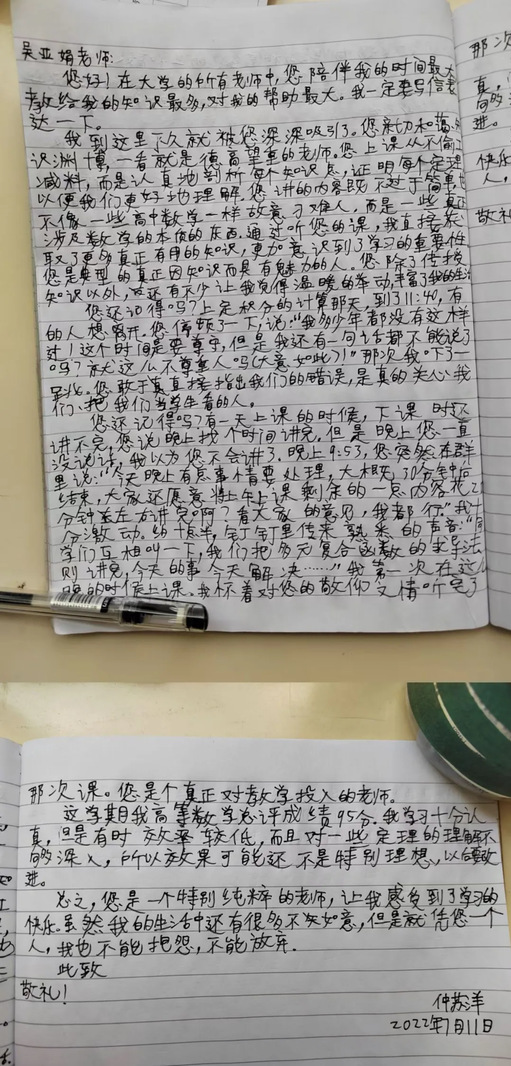 吴亚娟是2021级防灾专业仲苏洋最敬爱的老师之一,他清楚地记得,一次课堂上有知识点未来得及讲完,吴老师就在晚上专门开了一节网课完成教学,平时任何问题都事无巨细地回答。结课后,仲苏洋递给吴亚娟一封手写信,在信中深情表达了 对老师的敬爱和赞美,“您是一个真正对教学投入的老师,是一个特别纯粹的老师,让我感受到了学习的快乐!”
