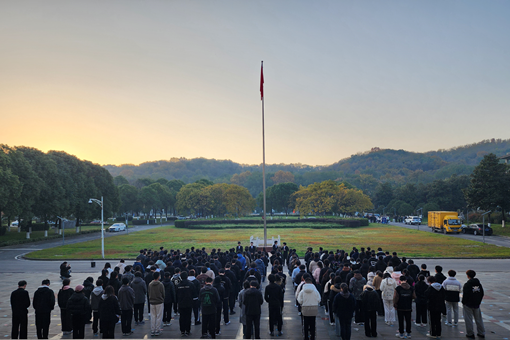 晨曦初照,学子们在滨江楼南广场整齐肃立。伴随着《义勇军进行曲》的铿锵旋律,国护队成员迈着坚定步伐走向升旗台,将鲜艳的五星红旗缓缓升起。雄壮的国歌响彻广场,激荡着学子们的爱国热忱和民族自豪感。全场肃立,目光坚定,凝望着那一抹鲜红在晨光中迎风飘扬。