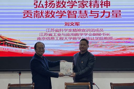 活动中,刘文军代表数统院向高邮一中赠送《共和国的数学家》全套书籍,并授牌共建 “数学文化科普教育基地”。刘文军在高邮一中报告厅面向高一学生做《弘扬数学家精神,贡献数学智慧与力量》主题报告。刘文军用贴近中学生生活实际的案例、生动直观的微视频和好玩有趣的“手指夹纸”游戏,深入浅出地向同学们科普了学习数学的意义。他通过祖冲之、华罗庚、苏步青、陈景润等家喻户晓的数学家故事,娓娓道出数学的精神内涵和价值;通过分析国内AI人工智能五大“卡脖”痛点,让学生了解了数学模型在医学、体育、音乐等各个领域的作用及当代青年肩负的使命和责任,引发同学们共鸣,点燃了他们的科学热情。