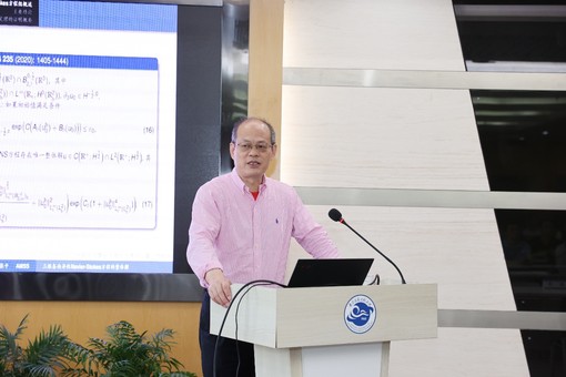 报告伊始,张平院士对三维各项异性Navier-Stokes方程模型做了深入浅出的背景介绍,并特别解释了这一偏微分方程模型与物理流体动力学和气象学之间的紧密关联。其后,张平院士详细回顾了相关课题二十年来的研究脉络。他结合自身科研经历,耐心而细致地阐述了每个科学问题的来龙去脉和研究动机。为了便于大家的理解,张平院士还穿插介绍了研究此类偏微分方程问题所用的数学工具,如Littlewood-Paley分解、Chemin-Lerner型函数空间、各项异性的Sobolev空间等。随后,张平院士详细介绍了他与合作者近期关于各项异性Navier-Stokes方程组整体解的存在唯一性定理。该结论表明:当时间大于0时,方程的解关于水平变量迅速解析,并且解的水平解析半径满足一个时间1/2次方的下界估计。最后,张平院士介绍了解决问题的主要思路,如Chemin引入的处理解析类能量估计及解析半径大小的工具、控制竖直变量的解析半径损失的方法等。