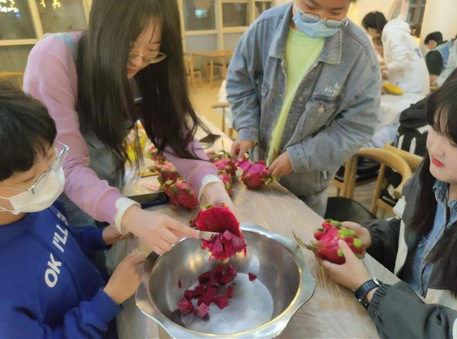 活动伊始,班干部们将提前准备好的水果带到食堂,班级同学按照既定的分组,有的负责清洗,有的负责去皮,有的负责切块,有的负责分装,分工合作,流水作业,热火朝天地“撸起袖子”干起来。水果食材准备好之后,全体同学根据自己对身边同学的了解,自主配餐,为自己的朋友、同学制作一份爱心“水果捞”。本次活动增进了同学之间的友谊,也有利于构建同学们正确的劳动价值观。