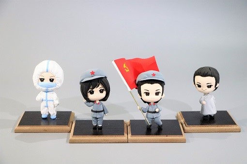 2019级应用统计学专业的杨沛函以“挑千斤重担 乘风浪前行”为主题制作了一组人物手办,获得了一等奖。她以时间为轴,选取了五四运动前后为救国奔走呼号的志士,在战争中勇敢前行、不畏艰苦的红军战士们,在新冠肺炎疫情下奋战在第一线的医护人员……在制作之前,杨沛函也考虑过不少创作方向,在和辅导员老师商量后,最终选择了目前的这四位人物。