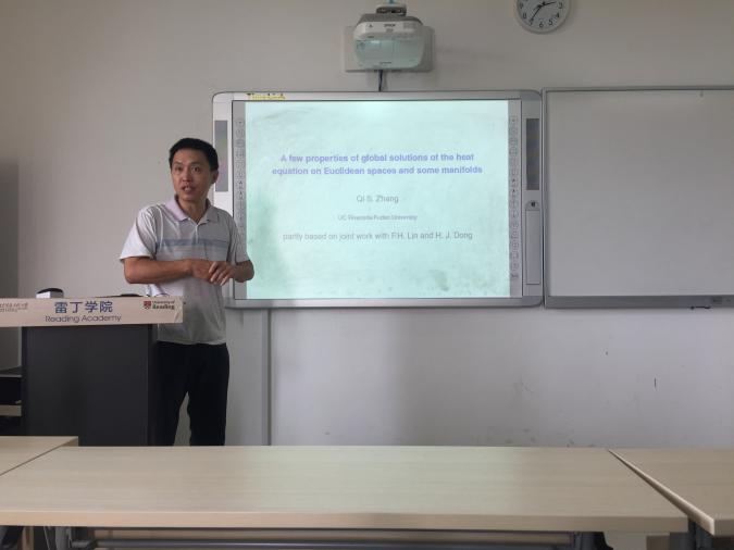 2019年9月12日,美国加州大学张旗教授受邀莅临我校指导,并在雷丁楼N414室作了题为 “A few properties of global solutions of the heat equation on Euclidean space and some manifolds” 的学术报告。报告由数学与统计学院刘文军副院长主持,数学与统计学院相关领域教师、研究生及本科生聆听了报告。