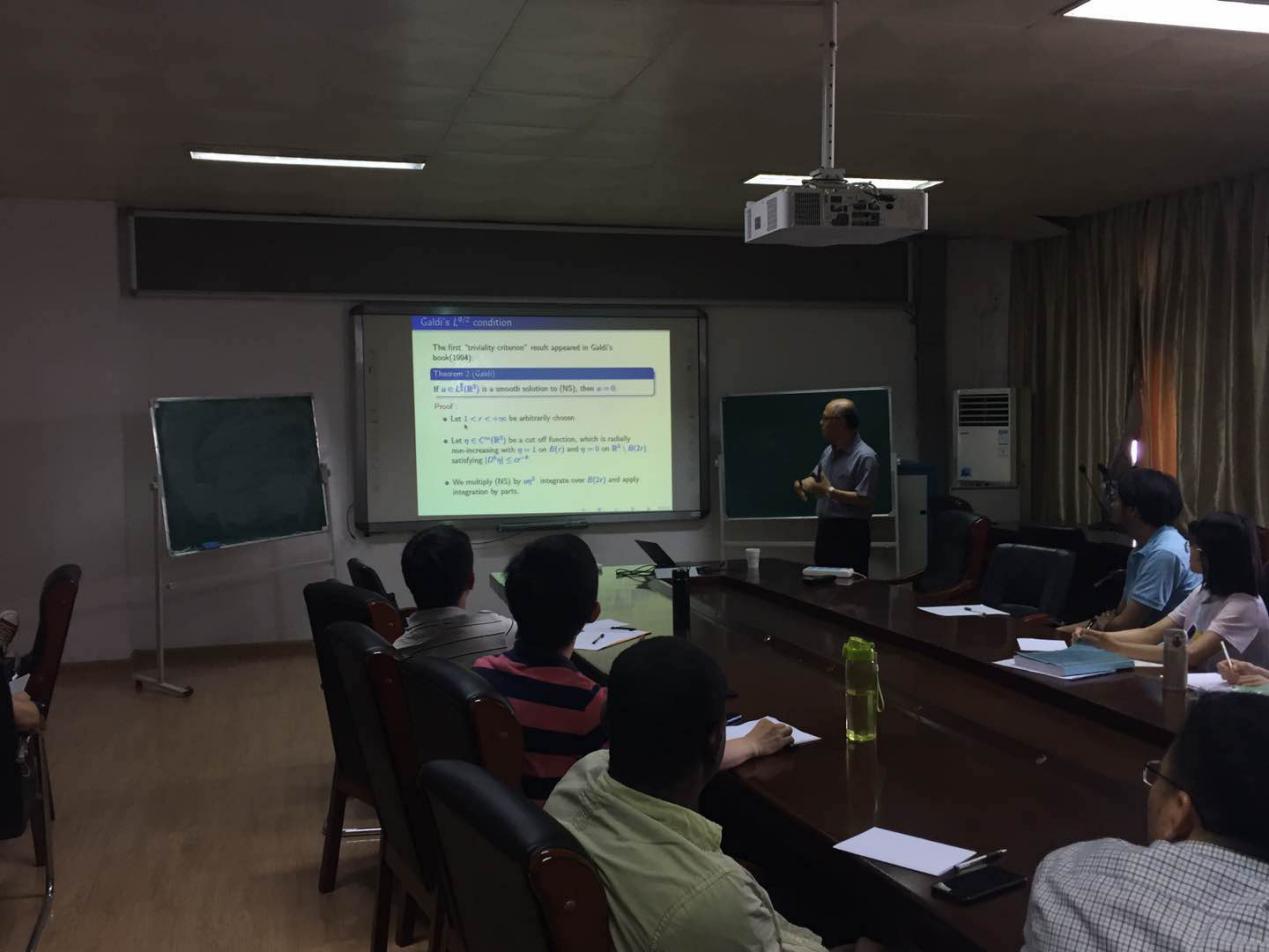 上午10时到11时,在和学院副院长刘文军教授亲切握手后,Chae教授于数统院尚贤楼808做了题为 “Liouville type theorems in the stationary Navier-Stokes equations” 的学术报告。报告首先详细介绍了问题背景以及一些著名的前人研究工作,之后Chae教授详细介绍了自己同合作者们近年来的一些重要研究成果,Chae教授还为其中部分重要结论详细介绍了证明思想,并同参会人员就特定问题进行了深入讨论。
