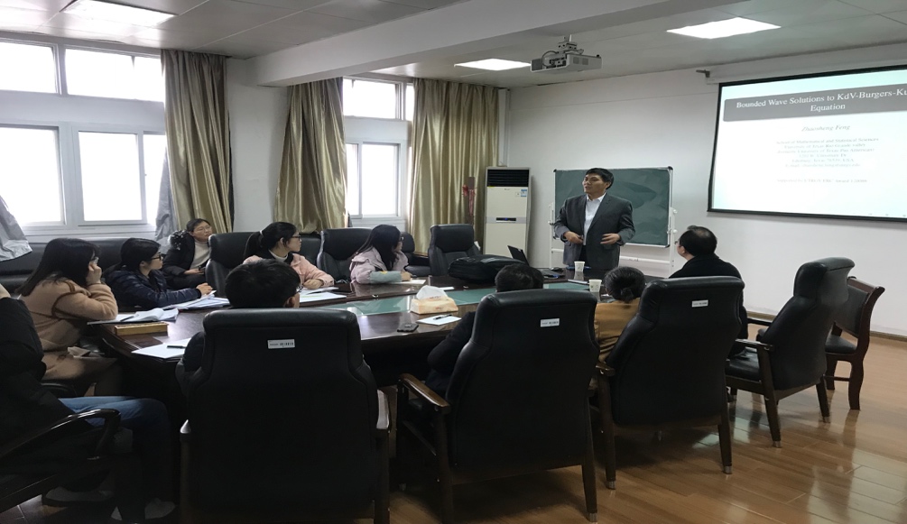 12月21日下午,美国德克萨斯大学冯兆生教授应邀来我校,在尚贤楼706会议室作了题为“Bounded Wave Solutions to KdV-Burgers-Kuramoto Equation”的学术报告。数学与统计学院生物数学与微分方程方向的师生参加了报告会,报告由刘文军教授主持。