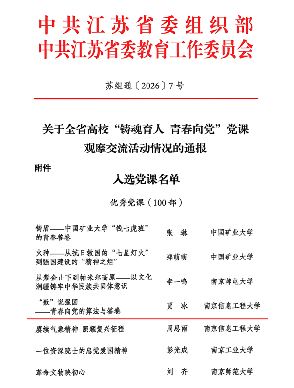 近日,由江苏省委组织部、省委教育工委联合主办的全省高校“铸魂育人 青春向党”党课观摩交流活动评选结果公布,我院党委书记贾冰主讲的《“数”说强国:青春向党的算法与答卷》获评全省100部“优秀党课”之一。
