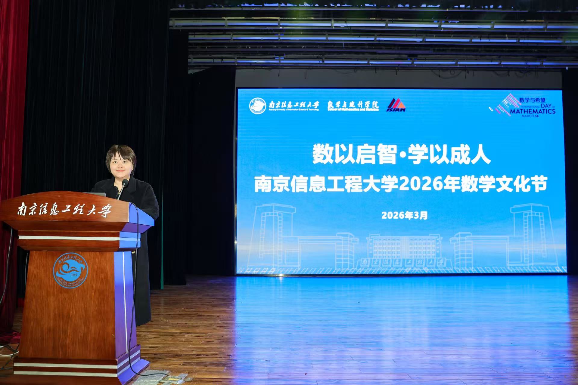 开幕式上,刘佳在致辞中向本届数学文化节的开幕表示热烈祝贺。她说,数学,作为人类文明最古老的语言,是理性与智慧的象征,更是推动科学进步、技术革新的基石。联合国教科文组织设立“国际数学日”,正是为了传递“数学是解决全球性挑战、创造美好未来关键工具”的核心理念。她向全体师生提出两点希望,一是推进学科深度交叉融合,以大气科学一流学科为牵引,将数学理论优势转化为解决气象预报、数据科学等关键领域问题的硬核能力;二是深刻认识数学价值,以实践为沃土,推动数学理论与实际场景深度结合,将抽象之美转化为解决社会痛点的切实方案。她寄语广大学子,点燃创新火种,在数学探索中锤炼逻辑、收获勇气。