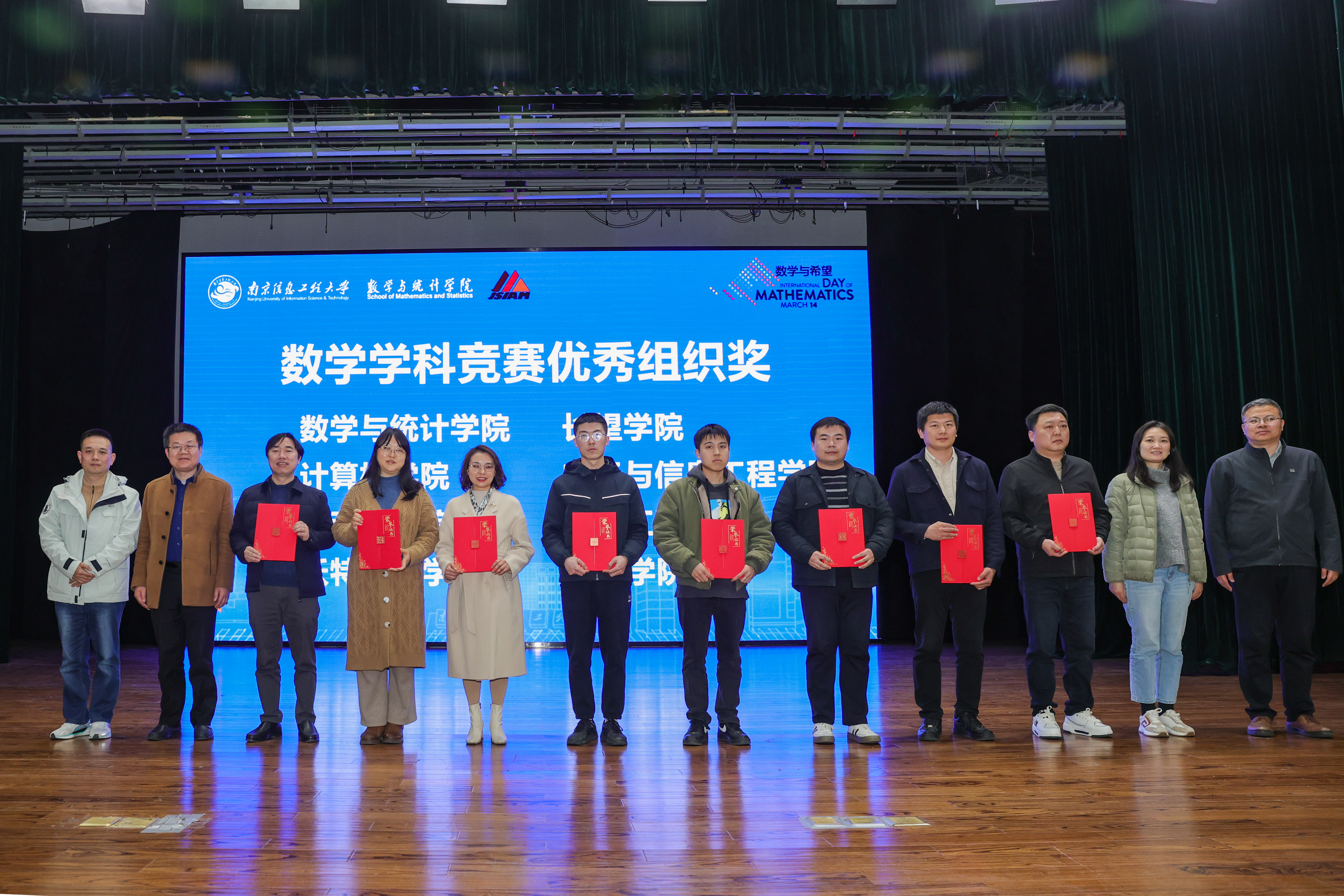 2025年,我校在全国大学生数学建模竞赛中再创佳绩。为表彰在竞赛组织中表现突出的单位,开幕式现场为自动化学院、电子与信息工程学院、计算机学院、数学与统计学院、管理工程学院、雷丁学院、沃特福德学院、长望学院等颁发了“数学学科竞赛优秀组织奖”,激励全校各学院继续凝心聚力,推动数学学科竞赛水平再上新台阶。