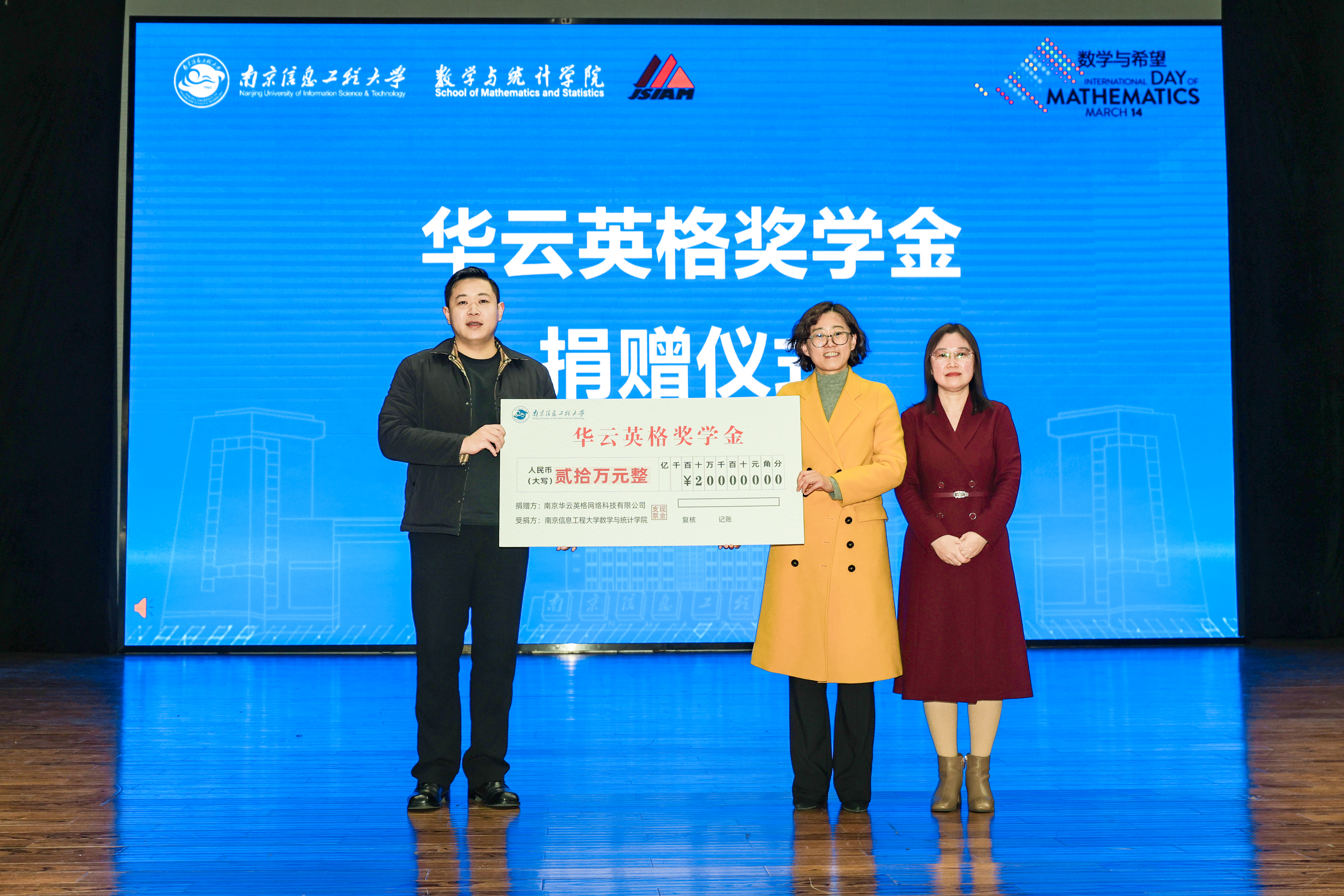 奖学金捐赠仪式上,霍昱安向母校捐资20万元,设立“华云英格奖学金”。他表示感恩母校的培养,并寄语南信大的学弟学妹们深耕技术前沿、积极参与科创竞赛与职业认证,不断提升综合素养。校友工作办公室主任成芳、数学与统计学院党委书记贾冰与霍昱安共同出席并完成捐赠仪式。