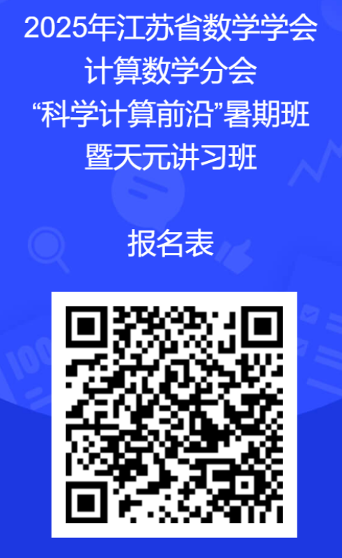 本次暑期班暨天元讲习班由江苏省数学学会计算数学分会主办,南京信息工程大学承办,受南京信息工程大学与国家自然科学基金数学天元基金(批准号:12426524)共同资助。热忱欢迎计算数学等相关领域从事科学计算的博士/硕士研究生、博士后和青年教师报名参加。希望通过暑期班系列短课的形式,为计算数学领域的教师、研究生和工程技术人员提供一个了解学科前沿发展动态的平台,帮助学员从入门到进阶、系统地掌握科学计算相关领域的方法和理论,进一步推动计算数学事业的发展。