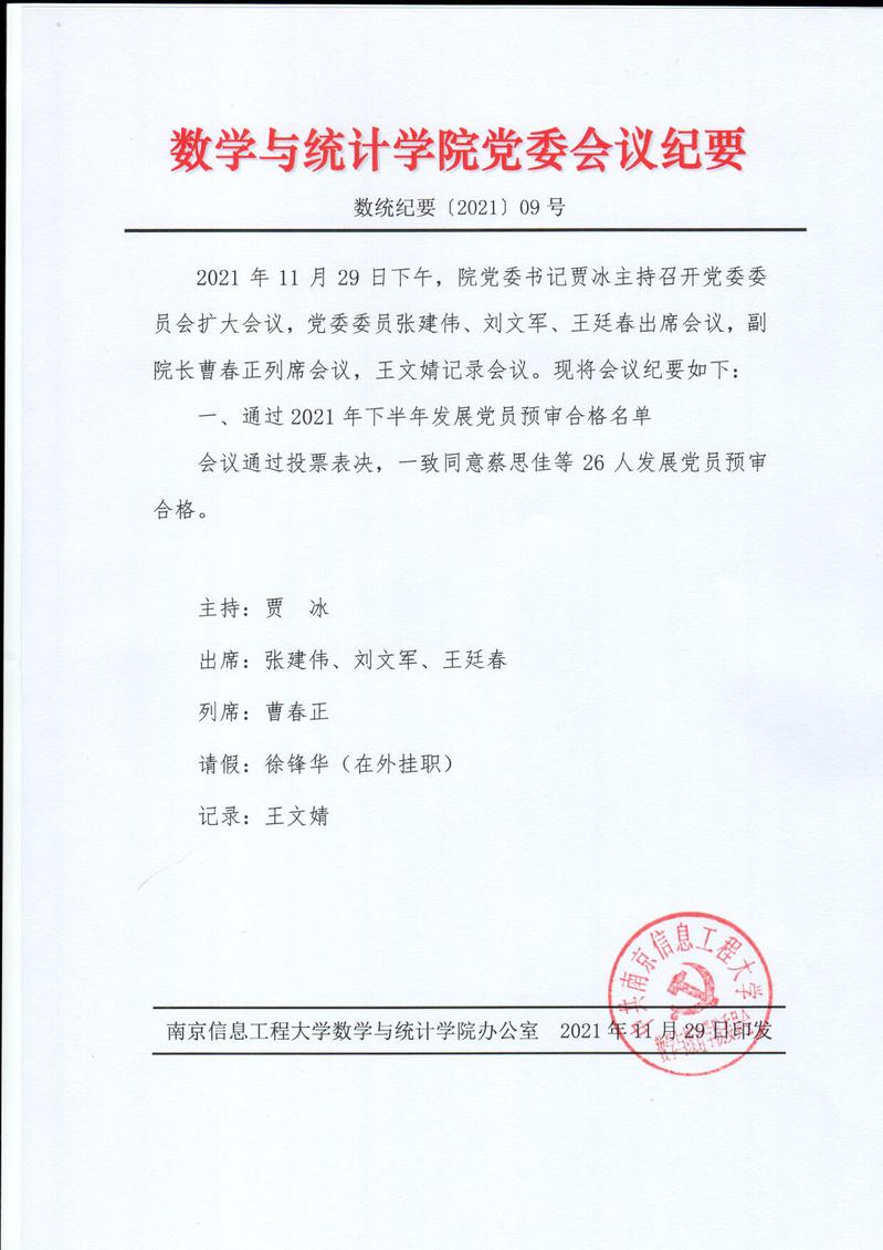 数学与统计学院党委会议纪要〔2021〕9号