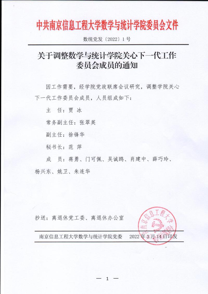 202201 关于调整数学与统计学院关心下一代工作委员会成员的通知