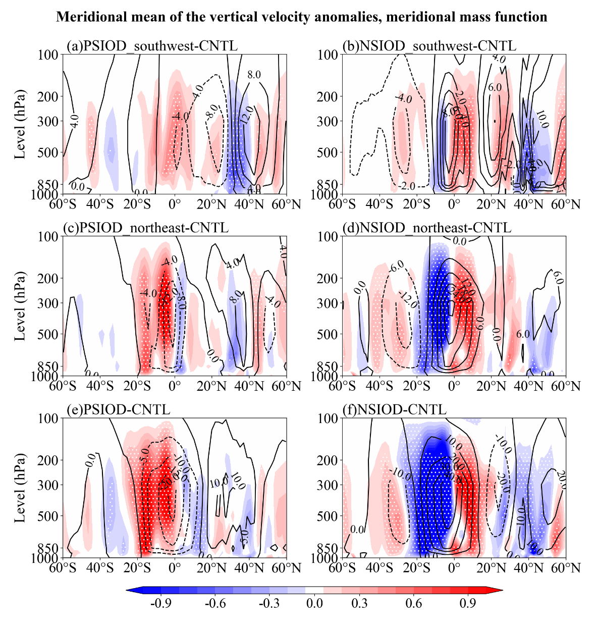 观测中(a)PSIOD年、(c)NSIOD年春季30°-120°E的垂直速度异常的经向平均值(阴影,单位:10-2Pascal/s)和经向质量流函数(等值线,单位:1010 kg/s),以及CESM模式中(b)PSIOD试验、(d)NSIOD试验与控制试验的差值,(c)-(d)与(a)-(b)相同,但为夏季,白色打点处表示垂直速度异常通过了0.05的显著性检验。