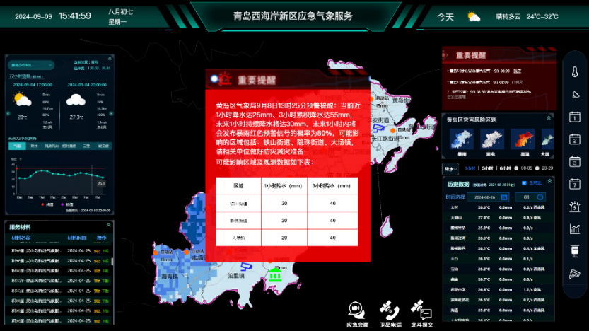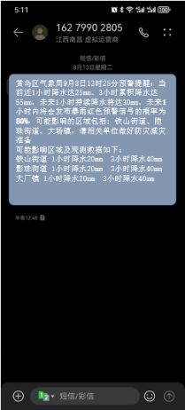 通过实况观测及短时预报数据分析,结合雷达回波数据反衍,预测天气过程,如:暴雨的发展趋势(持续或减弱、降水区域路径及移动速度)、暴雨洪涝灾害的发生概率,依据预警提醒指标,提前发布预警提醒通知信息,通知应急指挥人员将要发布气象灾害预警的等级、时间、概率、区域、风险等级及未来天气趋势等信息,提高应急部门的救灾准备时间的提前量,帮助应急部门提前、有序的部署防灾减灾人力、资源、制定应对措施。